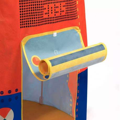 Bonita cabaña de juegos con forma de cohete donde podrán divertirse jugando a ser astronautas, o bien hacerlo un rincón de lectura. Ideal para el juego simbólico y para estimular su imaginación.Tiene una original puerta enrollable y dos ventanas. Las varillas de plástico con las piezas de conexión posibilitan un montaje fácil y rápido.