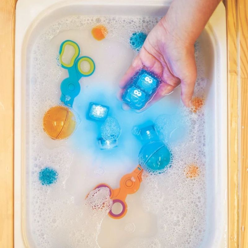 Los 4 cubos de luz azules Sesame Street de Glopals brillaran dentro del agua siendo tan sencillo apagarlos como sacándolos del agua.