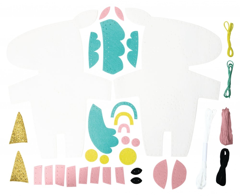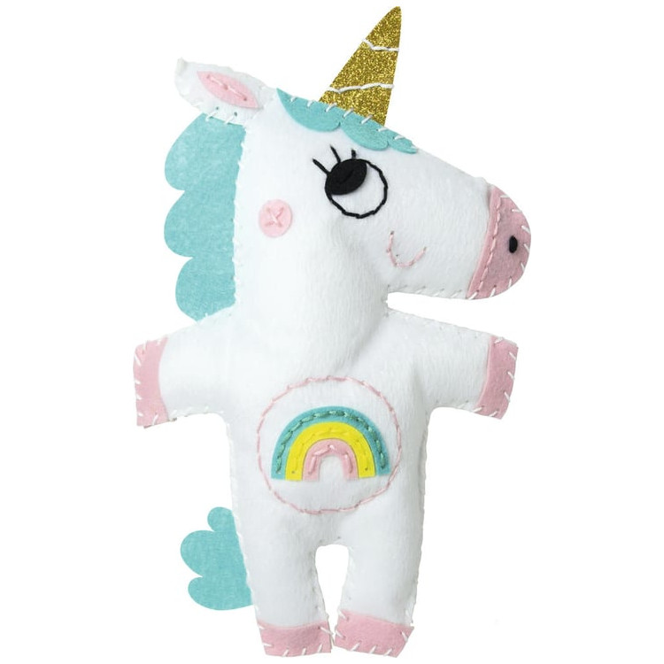 Incluye: piezas de fieltro troqueladas, piezas de fieltro adhesivas, guata, aguja de plástico, de 2 a 4 carretes de hilo, cinta, instrucciones.Medida del unicornio 16 x 5 x 26 cm