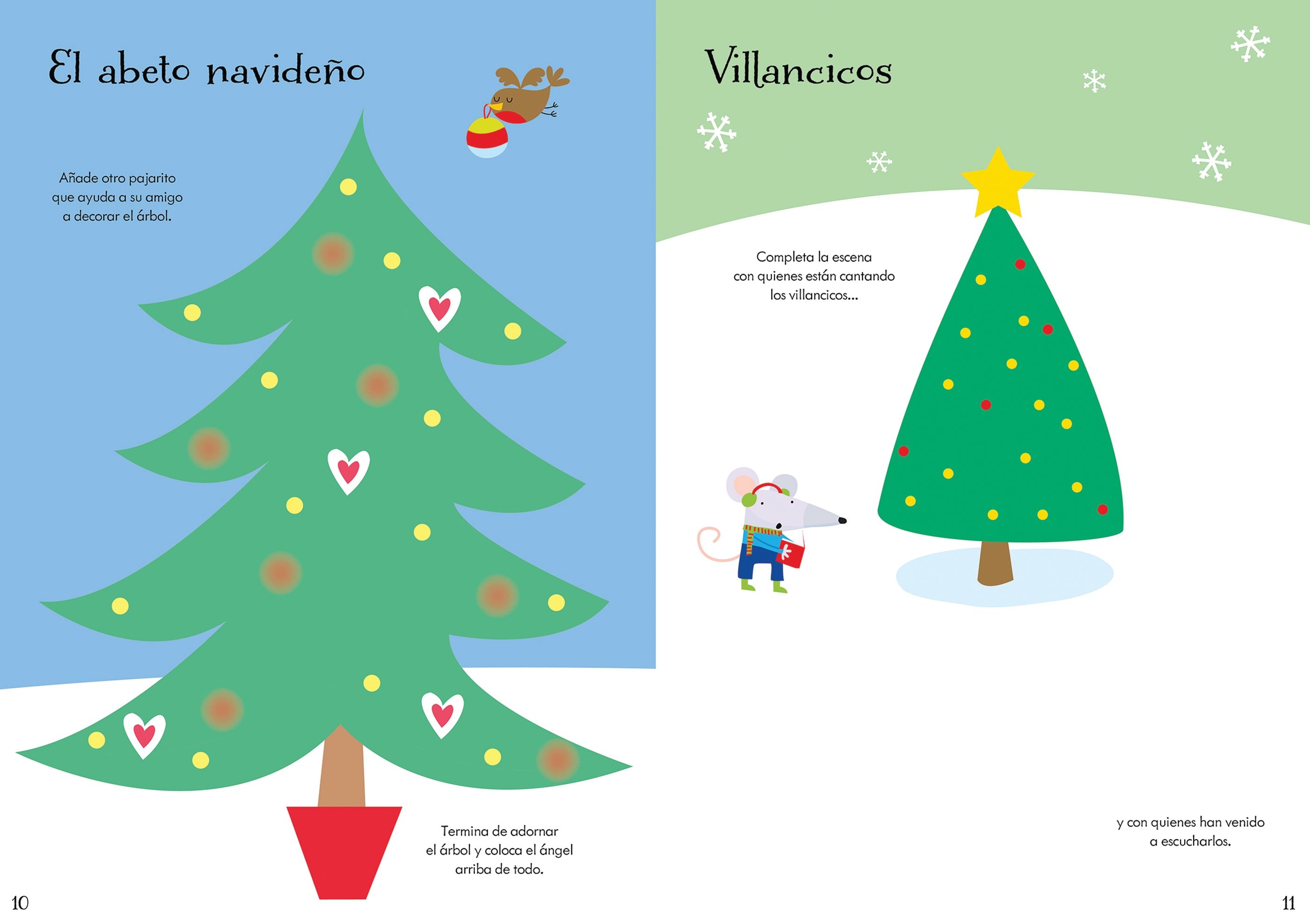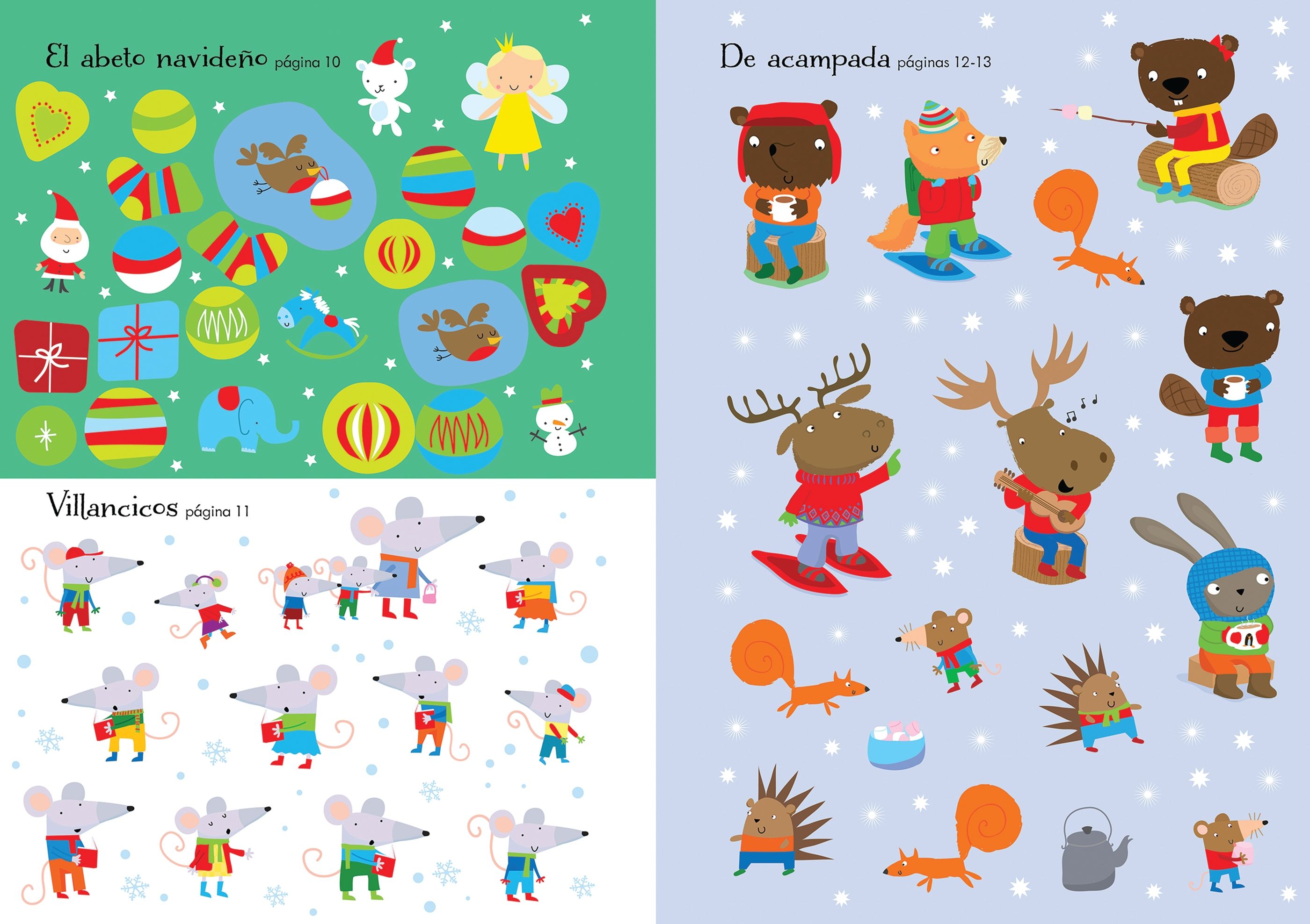 Más de 300 pegatinas reutilizables con las que dar vida a escenas invernales pobladas por animalitos y elfos que lanzan bolas de nieve, cantan villancicos, pasean por el mercadillo navideño o visitan el taller de Papá Noel.