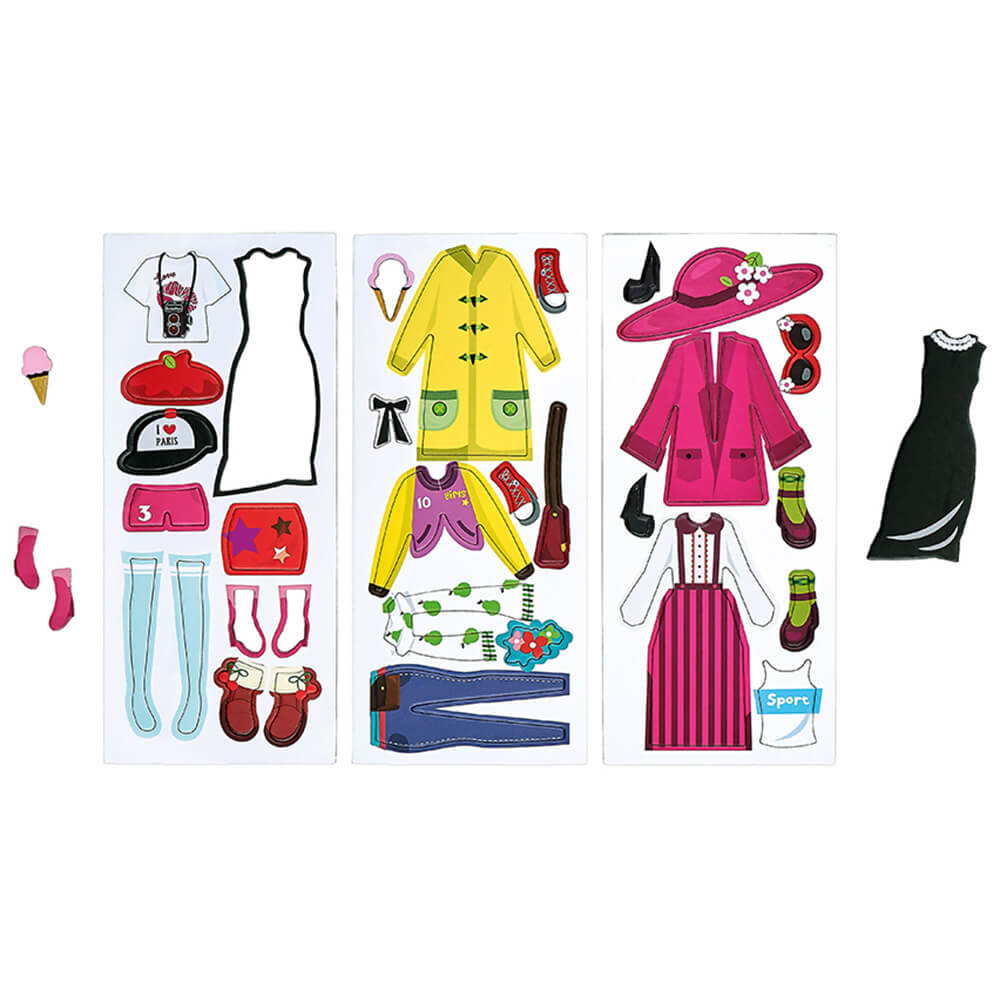 Juego magnético con 1 muñeca para vestir con 31 artículos diferentes para combinar.