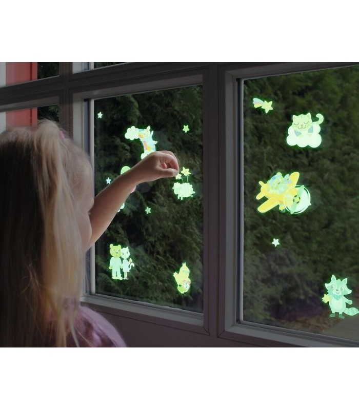 Set de 2 hojas de pegatinas para ventanas de colores que brillan en la oscuridad.Se recargan una y otra vez bajo una fuente de luz natural o artificial.
