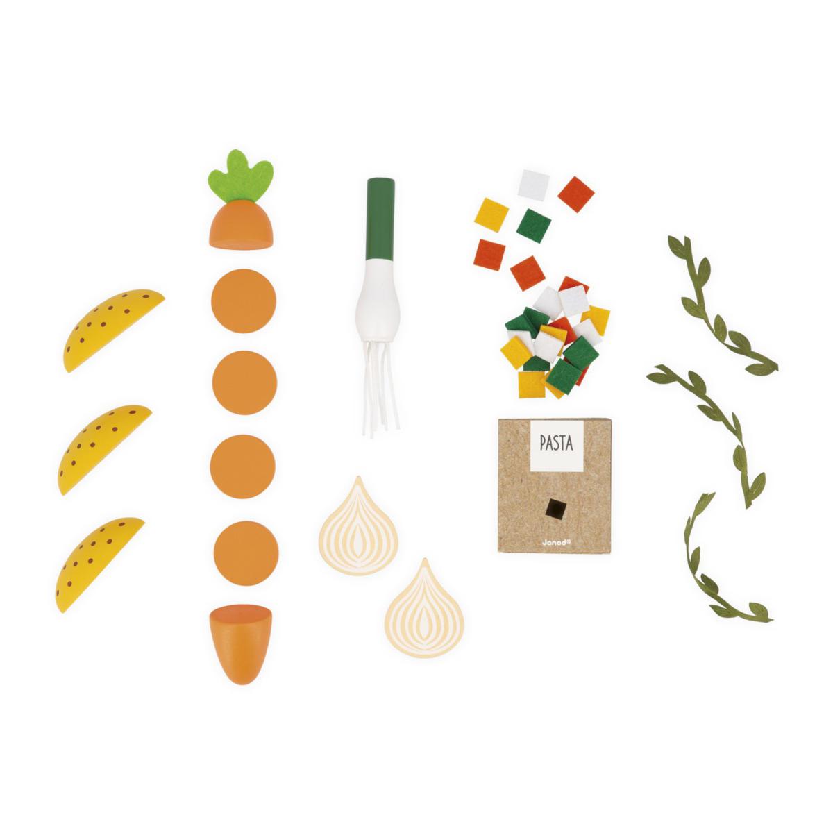 Este set está compuesto por 43 accesorios: una olla y un cazo de metal, una batidora para batir las verduras, 6 trozos de zanahoria, 2 cebollas, 3 trozos de patata y un puerro de madera, 3 ramitas de hierbas aromáticas de tela y 24 trocitos de pasta de colores guardados en su caja de cartón. ¡Perfecto para elaborar multitud de sopas adaptándose al gusto de cada uno!