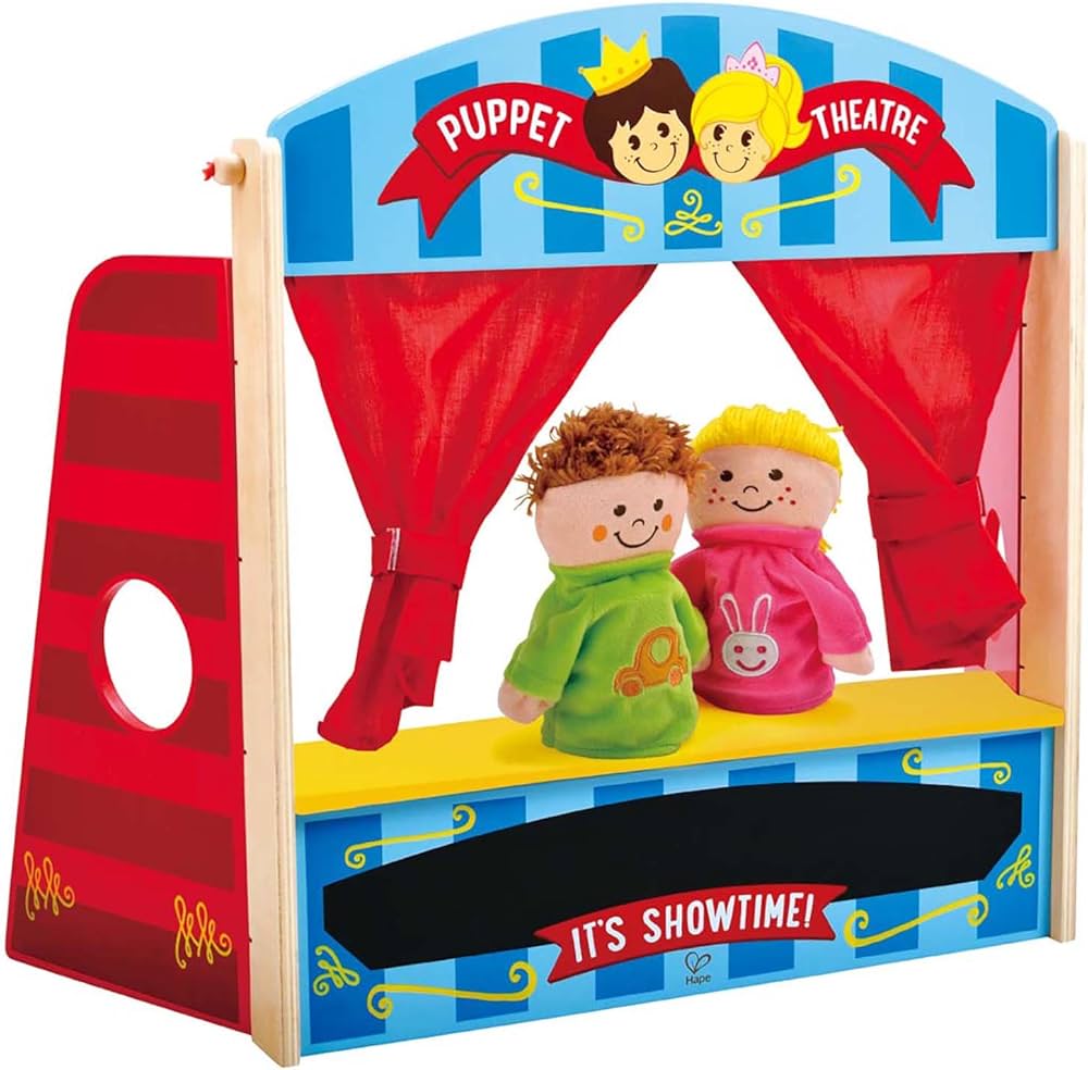 Crea tu propio espectáculo con estas dos marionetas y el escenario que las convierte en estrellas. El niño puede también usar sus propias muñecas, peluches o juguetes para que cada espectáculo sea diferente.